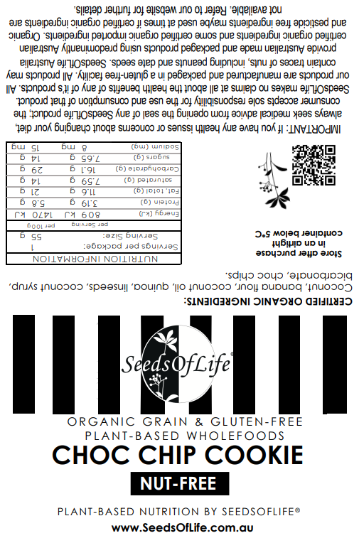 Prebiotic Nutrient dense Cookie with vegan 70% cacao choc chips. Certified organic ingredients Coconut, banana flour, coconut oil, quinoa, linseeds, coconut syrup, bicarb, vegan choc chips.