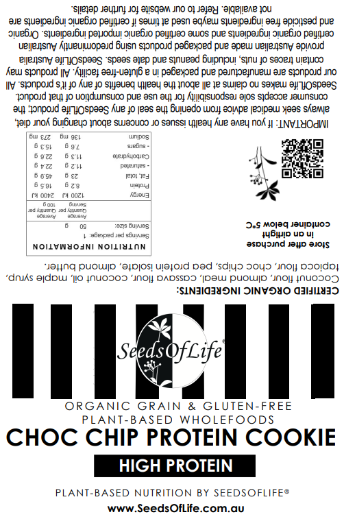 High Protein healthy snack cookie with a shortbread texture, made with pea protein isolate and vegan choc chips. Certified organic ingredientsAlmond meal, coconut oil, water, tapioca, maple syrup, pea isolate, vegan choc chips