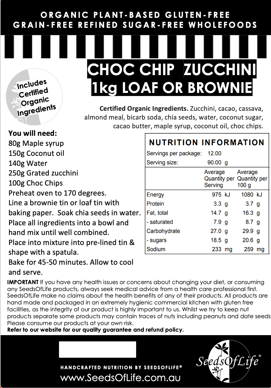 Certified Organic Ingredients. Zucchini, cacao, cassava, almond meal, bicarb soda, chia seeds, water, coconut sugar, cacao butter, maple syrup, coconut oil.