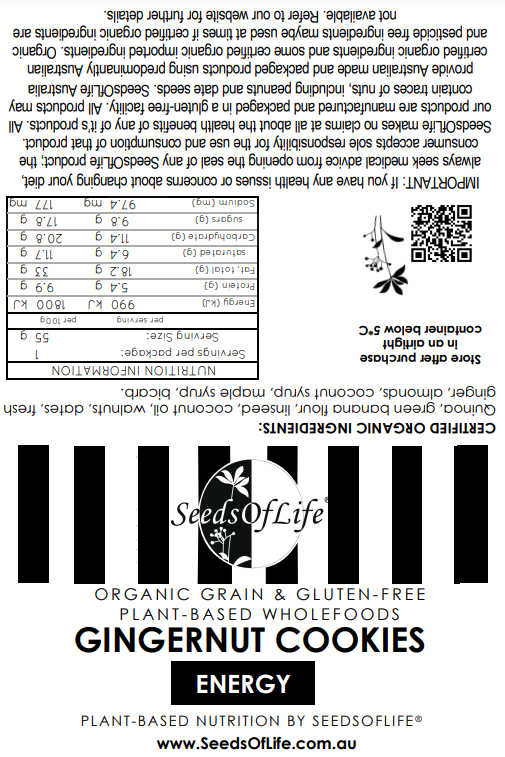 Prebiotic Nutrient dense crunchy cookie with a chewyness inside. Certified Organic Ingredients. Walnuts, dates, ginger, coconut oil, almond meal, banana flour, quinoa, linseeds, coconut syrup, maple syrup, bicarb. Allergy Friendly