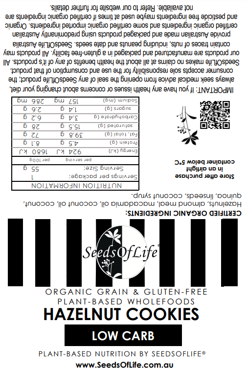 Low carb cookie made with crumbled hazelnuts. Certified organic ingredients hazelnuts, linseeds, quinoa, almond, coconut oil, coconut flour, coconut syrup, bicarb. Keto and allergy friendly.