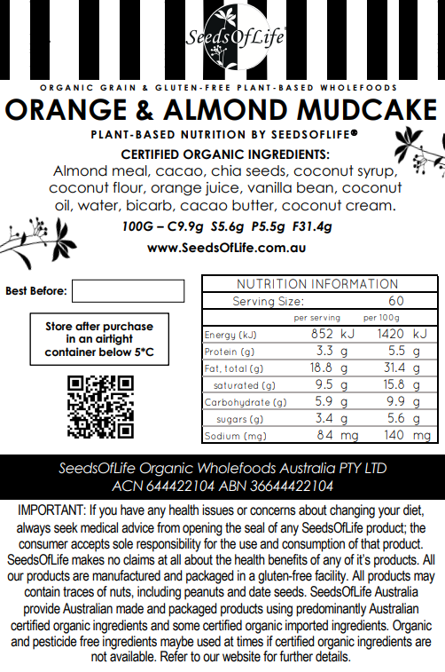 Low carb chocolate mudcake with orange juice. Almond meal, chia seeds, coconut syrup, vanilla bean, coconut oil, water, bicarb. cacao butter, coconut milk, coconut syrup, cacao, walnuts, coconut oil.