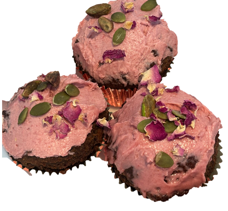 Pistachios, quinoa, almond meal, bi carb, cardamon, coconut yogurt, maple syrup. Frosting: coconut cream, beetroot juice cashews, cacao butter.