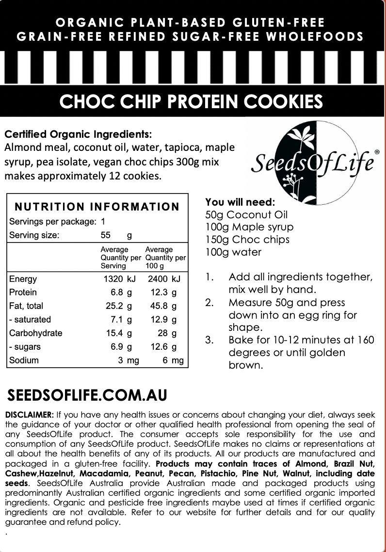 High Protein healthy snack cookie with a shortbread texture, made with pea protein isolate and vegan choc chips. Certified organic ingredientsAlmond meal, coconut oil, water, tapioca, maple syrup, pea isolate, vegan choc chips