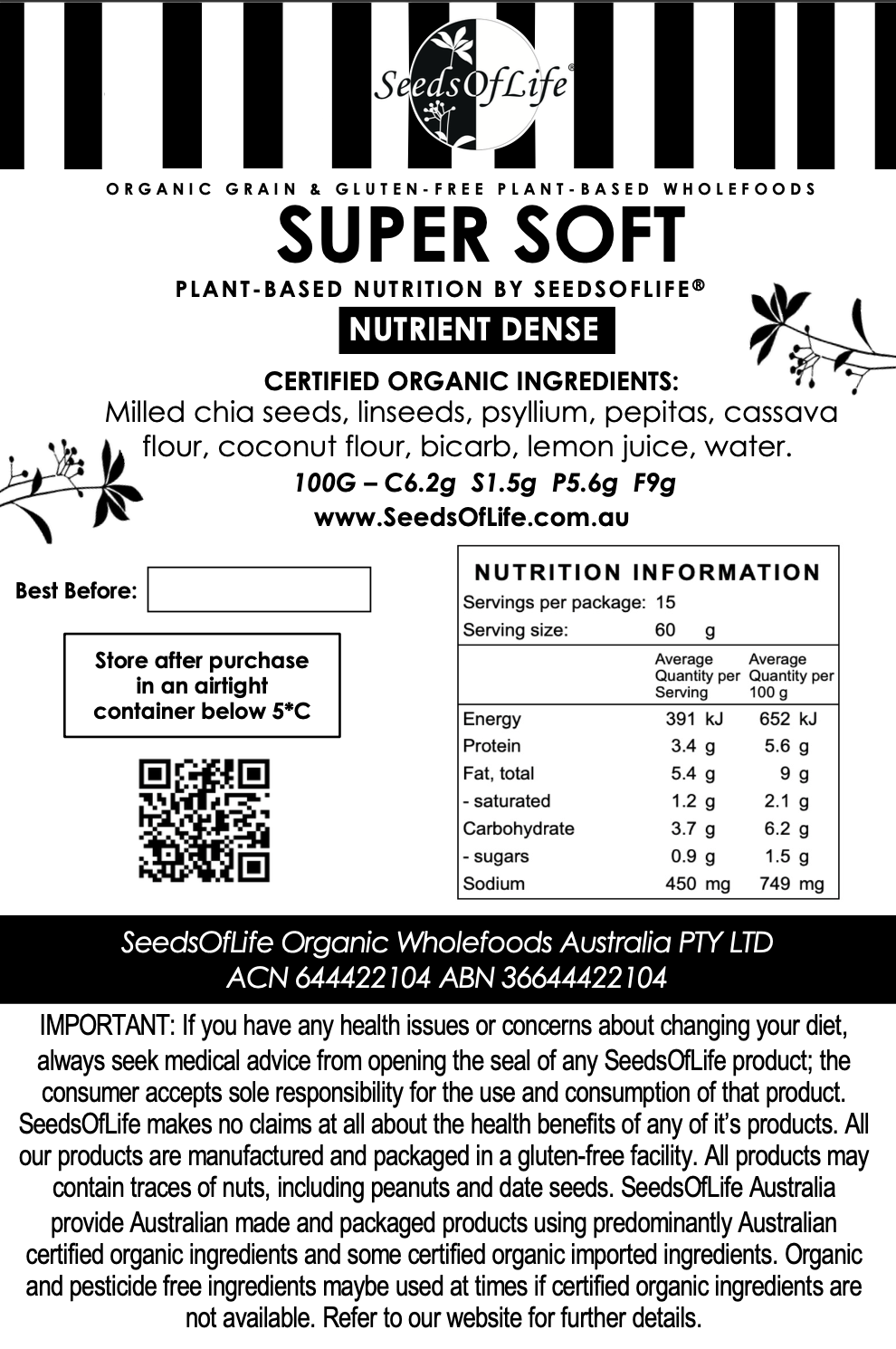 This one is our favourite sandwich bread, and the most popular bread for kids. Certified Organic Ingredients; Milled chia seeds, linseeds, psyllium, pepitas, cassava flour, coconut flour, bicarb lemon juice, water.
