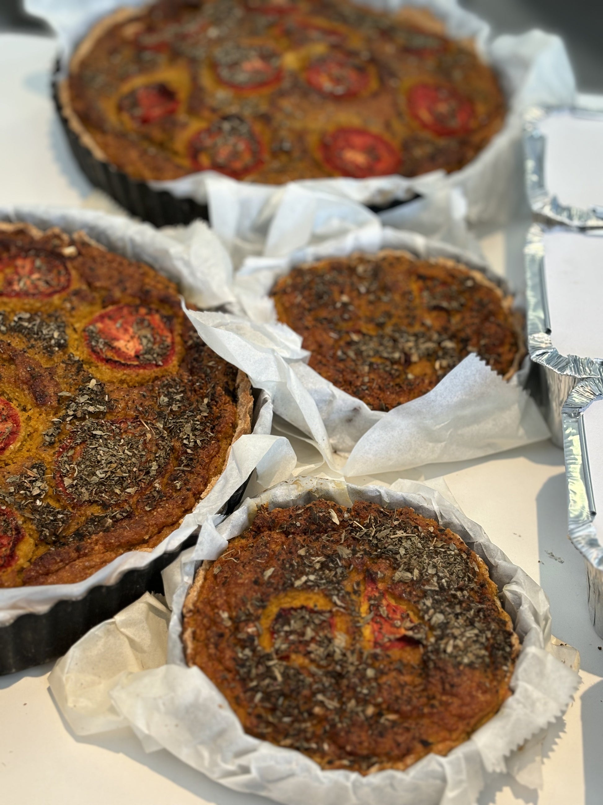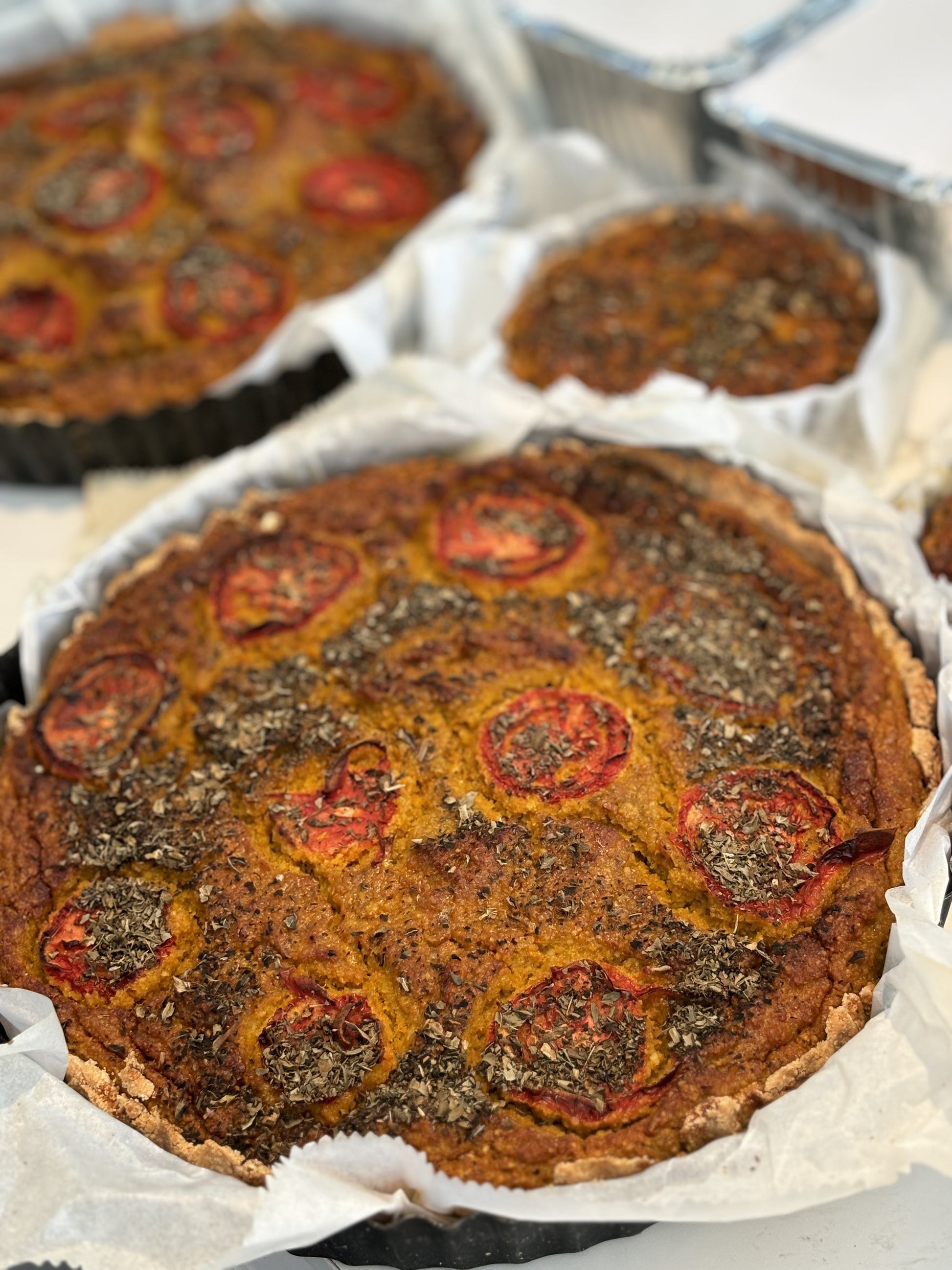 Cassava flour, almond meal, coconut flour, coconut oil, cashews, sweet potato, basil, tomatoes, olive oil.